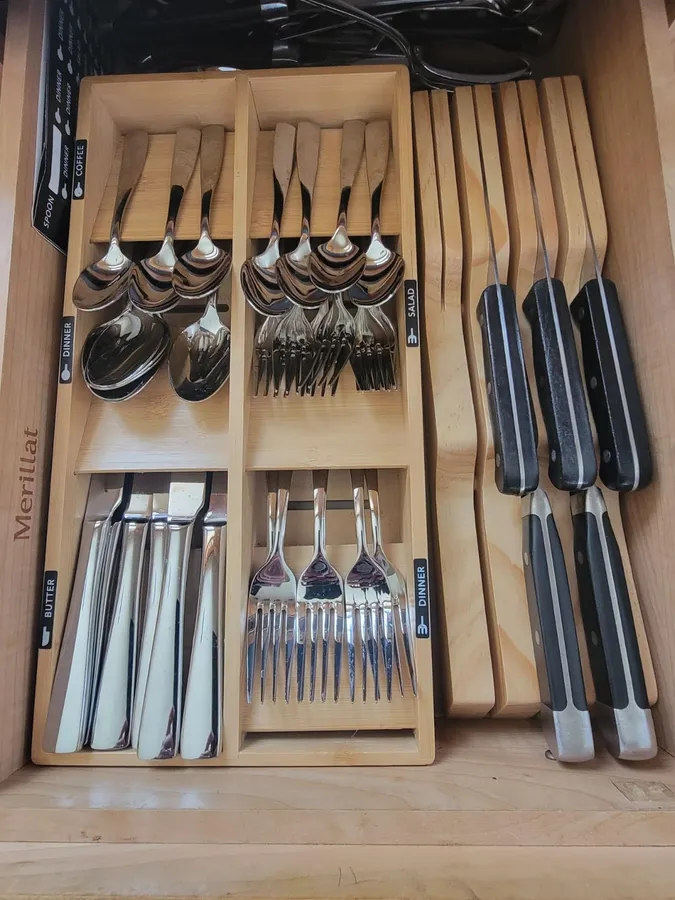 - KITCHEN UTENSILS STORAGE - Designed to hold silverware, utensil, flatware, cutlery, spoons and knives; The bamboo organizer for kitchen storage organization is 2.4" High; MEASURE YOUR DRAWER HEIGHT FIRST